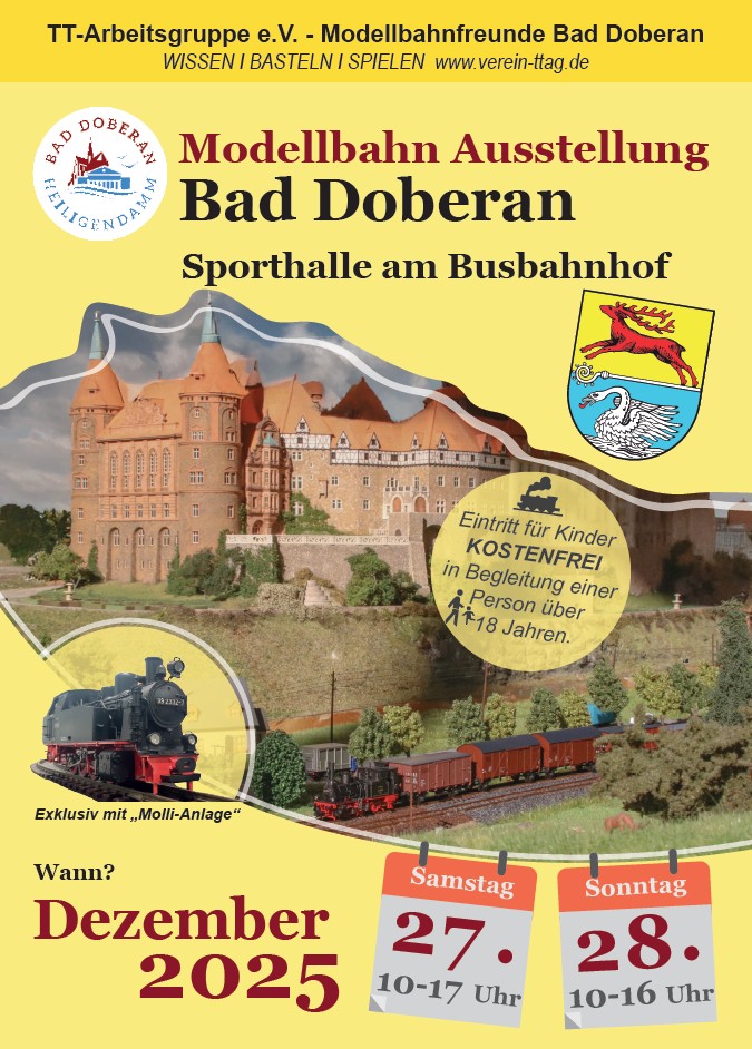 27.12. – 28.12.2025 Modellbahnausstellung TT-Arbeitsgruppe e.V. – Modellbahnfreunde Bad Doberan Veranstaltungsort: Sporthalle am Busbahnhof in Bad Doberan Öffnungszeiten: Samstag: 10:00 Uhr – 17:00 Uhr und Sonntag 10:00 Uhr – 16:00 Uhr Flyer zum Download: MOBA-DBR-2025 |