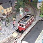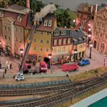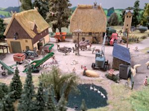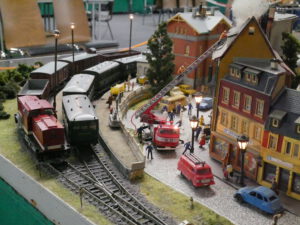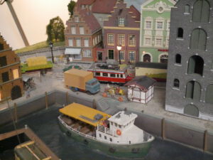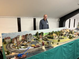 Daneben wurde nach längerer Zeit die bekannte H0/H0e-Hafenbahn unseres vor drei Jahren verstorbenen Modellbahnfreunds Klaus Brumm gezeigt. Die vielen Bewegungsmodelle, sei es der Schornsteinfeger auf dem Bahnhofsdach, der auf dem Plumpsklo Zeitung lesende Bauer, der kreisende Storch usw., zogen die Besucher in ihren Bann. Die Geschichten zu den Vorbildern der Modelle auf der Anlage, die sich hier in der Gegend befinden oder befanden, faszinierten die Zuschauer. Zum Schluss präsentierten Hans und Annalena Schulz zwei Anlagen. Auf der Lego-Anlage wurde eine Kirmes mit Achterbahn, weiteren Fahrgeschäften und einer Kindereisenbahn gezeigt.