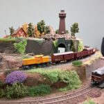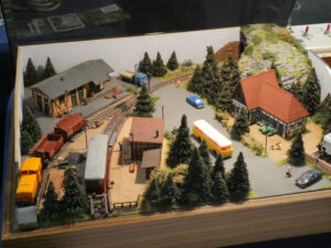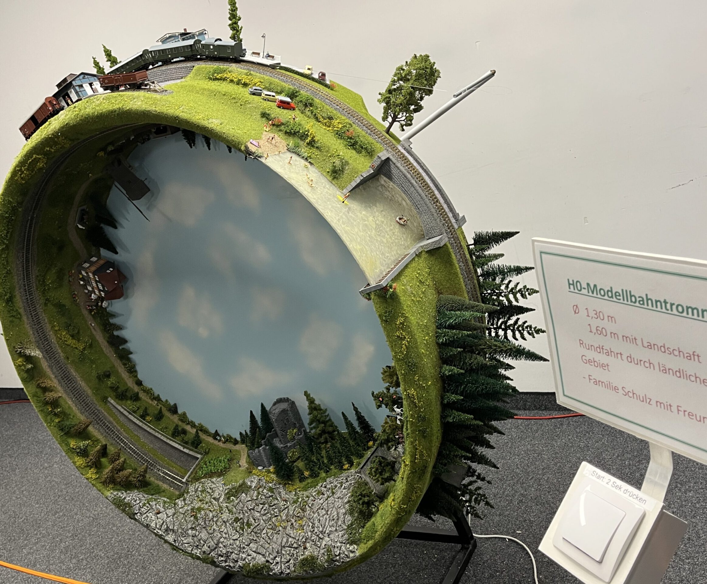 Ganz ungewöhnlich war die Anlage, zu der man philosophisch meinen könnte: „Die Welt ist eine Tonne.“ Auf der Außenseite drehte sich die besagte Tonne mit ihrer gestalteten Landschaft unter dem stehenden Zug. Wenn die fliegende Hexe mit ihrem Hexenhaus den Zug passierte, erklang ihr hämisches Lachen. Auf der ebenfalls landschaftlich gestalteten Innenseite fuhr ziemlich synchron ebenfalls ein Zug. Alles in Allem hat diese Ausstellung richtig Freude bereitet.