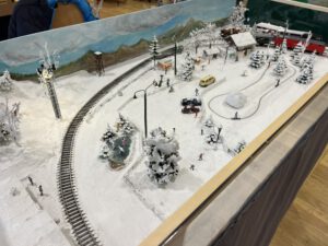 Nun zu den ausgestellten Modellbahnanlagen: Im Fahrbetrieb wurde unsere N- Vereinsanlage (6-Meter) von unseren Vereinsmitgliedern Thomas Rick und Ulrich Schmidt vorgeführt. Vereinsmitglied Matthias Scheller stellte eine kompakte N- Heimanlage vor. Unsere H0- Vereins-Berganlage, allzeit beliebt bei den Besuchern und deshalb ein Klassiker, wurde von Vereinsmitglied Jörg Meyer betreut. Als Gast führte Modellbahnfreund Erik Zier in der Spurweite H0e seine Heimanlage „Schönheide-Nord“ vor, die von ihm in Segmentbauweise gebaut wurde. Eine winterlich gestaltete N- Heimanlage zeigte Vereinsmitglied Andreas Henke den Besuchern.