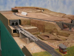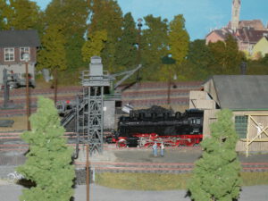 Was bekamen die Zuschauer auf dieser Ausstellung zu sehen? Neben dem Eingang hatte unser Modellbahnfreund Andreas Henke eine kleine Rangierspielanlage in der Nenngröße TT aufgestellt. Die Aufgabe galt es zu lösen, zwei Güterwagen aus ihren Ausgangspositionen auf die jeweils gegen­über liegende, vom anderen Güterwagen besetzte, Position zu rangieren. Dabei durfte nur die Rangierlok durch den Tunnel fahren. Zum Schluss musste die Lok wieder vorn zwischen den beiden Güterwagen im Bereich der Weiche zum Ladegleis mit Rampe abgestellt werden. Ebenfalls in der Baugröße TT ist die ca. 4 m große Heimanlage unseres Modellbahnfreunds Helge Overheu gebaut worden. Der Bahnhof eines Dorfes oder einer Kleinstadt mit einer kleinen Lokeinsatzstelle sowie einer von einer eingleisigen Hauptbahn abzweigenden Nebenstrecke bilden das Anlagenmotiv.